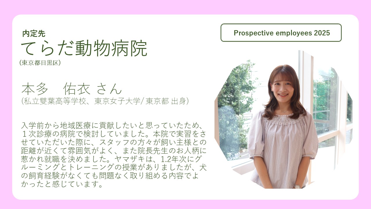 学校生活でひとつエピソードを挙げるなら、3年生のビジネスマナー(現キャリアアップ)の授業で、クラスメイトの前で一人数分間スピーチをするという内容があったのですが、そこで「動物看護師長になる!」と宣言したのを覚えています。当時は友人に「大きく出たね~」とからかわれましたが、今こうやって当時の夢を実現することができ、改めて身の引き締まる思いでいっぱいです。